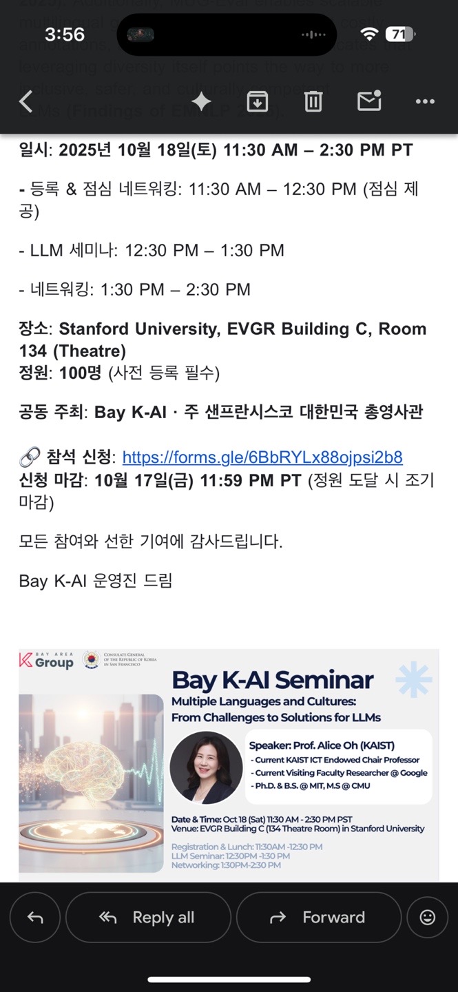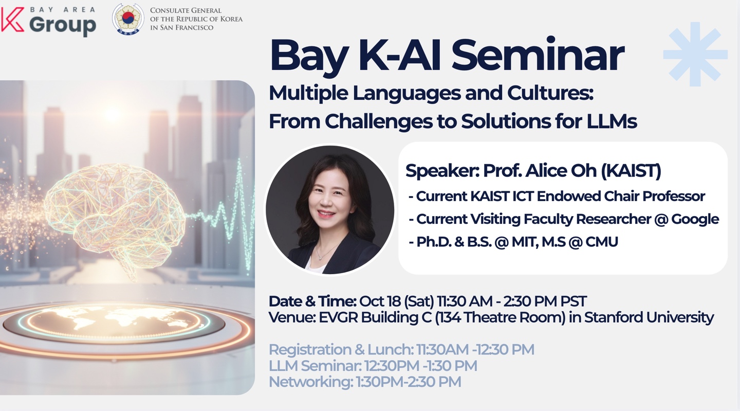 10월 18일 K-AI Group (K-Group AI 소그룹)에서 하는 LLM Seminar가 있어서 공지드립니다. KAIST의 LLM 전문가이신 오혜연 교수님 (현 Google 안식년)이 연사이시구요. 관심있으신 분들의 많은 참여 부탁드립니다. 세부 사항은 밑에 첨부 참고하시고, 인원 파악을 위한 Form에 Sign-up 해주시면, 감사하겠습니다.