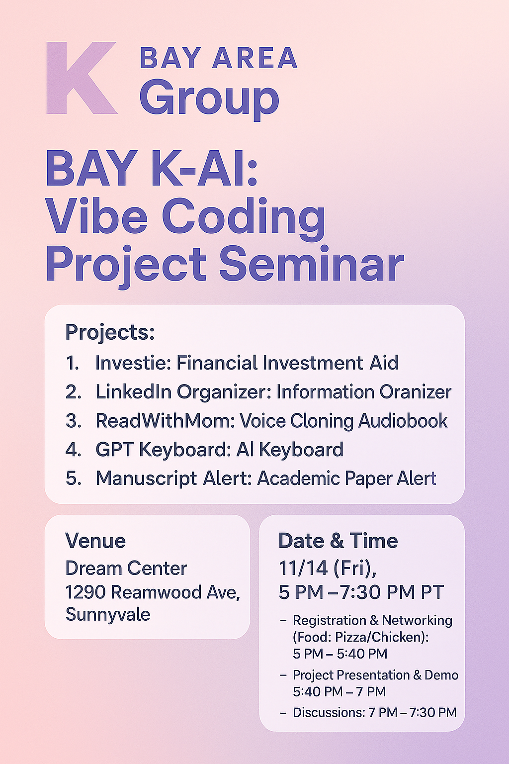11월 14일 (금요일)에 K-AI Group (K-Group AI 소그룹)에서 하는 Vibe Coding Seminar가 있어서 공지드립니다. 관심있으신 분들의 많은 참여 부탁드립니다. 세부 사항은 밑에 첨부 참고하시고, 인원 파악을 위한 Form에 Sign-up 해주시면, 감사하겠습니다.